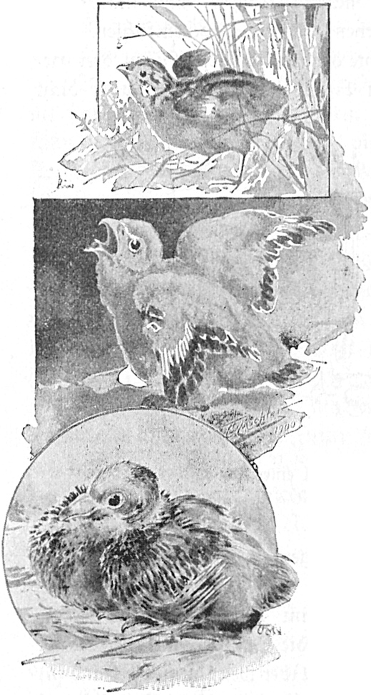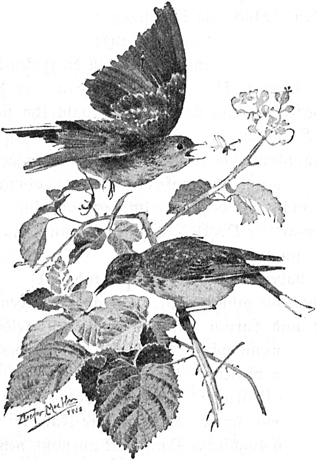Rotkehlchen, Drosseln, Amseln, Finken und Zaunkönige singen lustig darauf los, und viele andere kleine Vögel[S. 11] stimmen ein. Wenn sie alle zusammen singen, kann man nicht leicht das Lied des einen von dem des anderen unterscheiden, selbst das der Drossel nicht, obwohl sie am lautesten und am hellsten von allen singt.