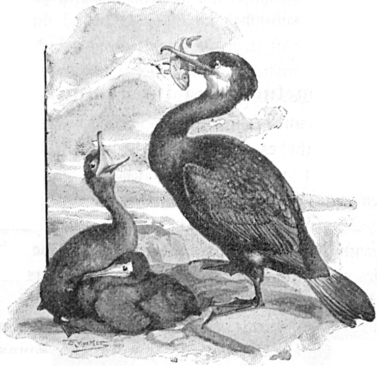 Einige von euch haben vielleicht auch schon Kormorane (siehe S. 33) gesehen, große schwarze Vögel, die schwerfällig über die See hinfliegen, mit weit vorgestreckten langen Hälsen und schmalen Flügeln. Sie lassen sich dann auf dem Wasser nieder und tauchen plötzlich mit dem Kopfe voran unter; gleich darauf kommen sie mit einem Fisch im Schnabel herauf, den zu verschlingen sie oft längere Zeit gebrauchen.