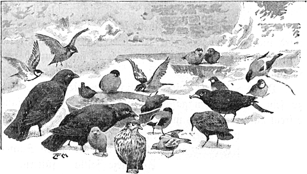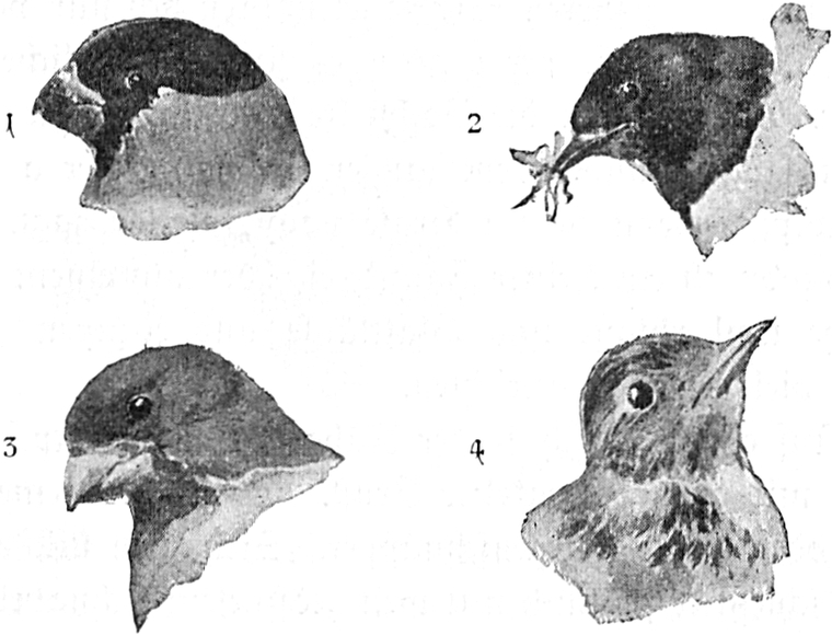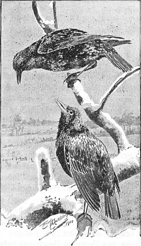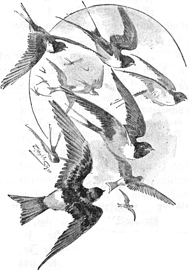 Die meisten Vögel, die ihr kennt, pflegen das ganze Jahr bei uns zu bleiben. Aber nicht alle tun dies. Der Segler (Turmschwalbe) beginnt schon Ende Juli nach dem Süden zu ziehen, und die Hausschwalbe und Mauerschwalbe folgen im Oktober. Wenn sie fort sind, kommen Schwärme[S. 9] von Krammetsvögeln aus dem Norden und fressen von den roten Beeren der Eberesche und von den schwarzen Holunderbeeren.
