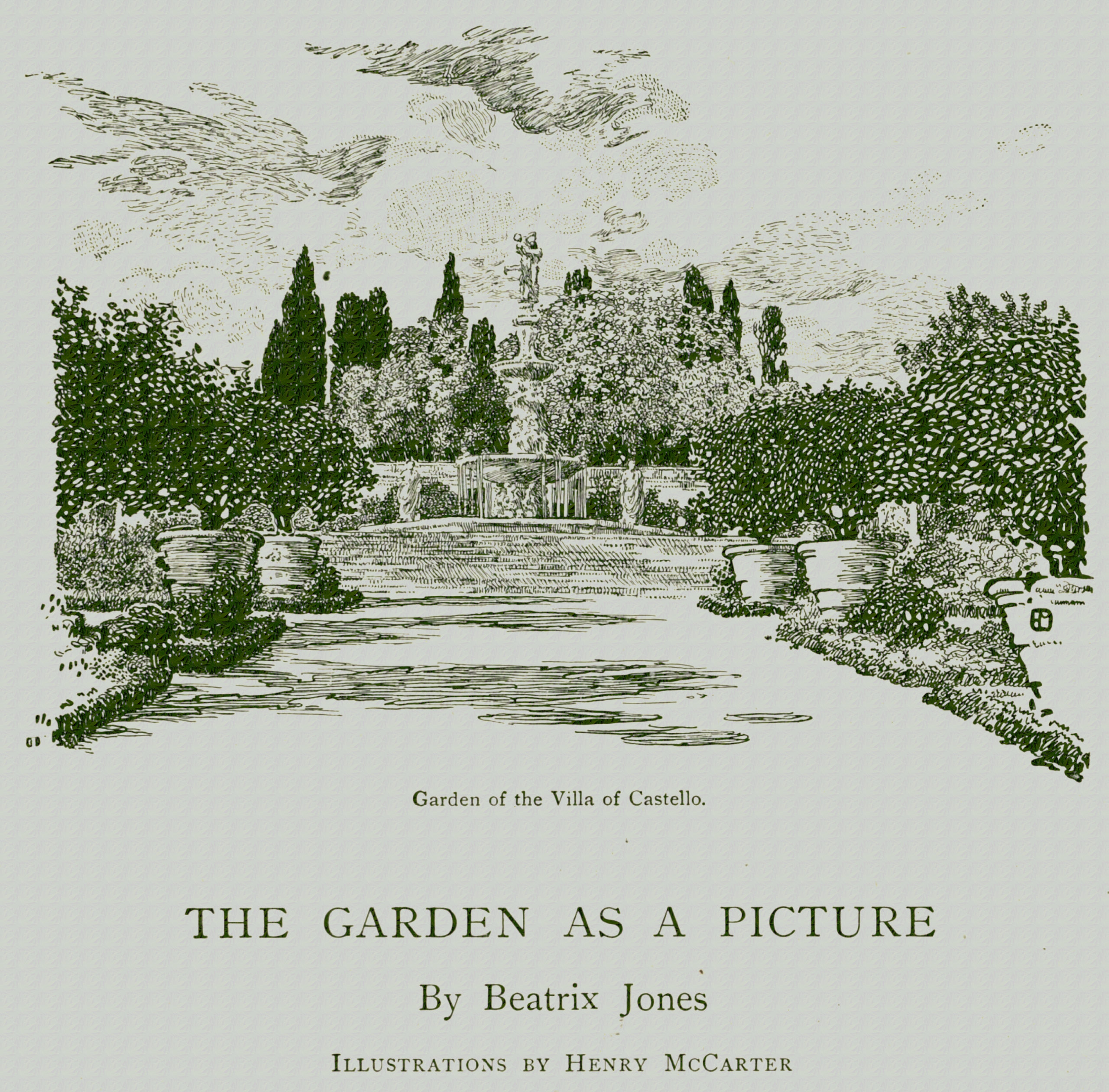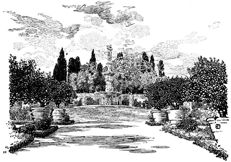 The gardener must also consider the length of time in each year in which his work will be looked at. In the north it is difficult to keep one from being more or less unattractive during six months at least; therefore, if a country house is to be lived in for the larger part of the year it is better not to put the garden too close to the house, as in that case the owners will have for several months a dreary view of garden walks with puddles in them and flower-beds covered with manure, or at best with evergreen boughs and leaves. If, however, they only stay in the country for two or three months it is comparatively easy to arrange a mass of color like a Turkey carpet, in which flowers are laid in in broad washes. This brilliant effect can be held for a couple of months, and during that time there need be no holes where flowers have died which have served their usefulness and left not even a tuft of green leaves to cover the brown earth. If the garden has to be presentable from early spring to late autumn it will be impossible, unless it covers a considerable piece of ground, to do more than keep a continuous succession of bloom in small patches rather than in great masses. Breaks in the surface of the ground are also needed, like terraces, arbors to interrupt long walks by shadow, benches and balustrades. Here is where the old Italian gardens are so successful; their fountains and their statues, their benches and their vases, 7are used as emphasis to give height or light or variation to a part of the composition which might otherwise be uninteresting. In the great Italian garden of Castello the whole interest of the parterre is focussed at the centre by the splendid high bronze fountain of Hercules and Antæus by John of Bologna and Tribolo. It is difficult to put a rule into words which will serve as a guide in even one hypothetical place, perhaps for the same reason that no two people would paint exactly the same picture from the same subject, or tell the same story in the same words.