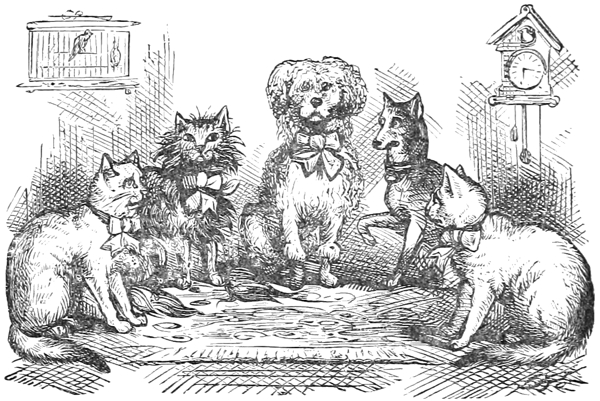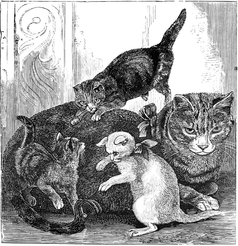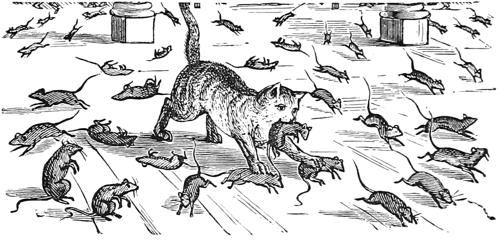 “After the King of the Cats died, and the King of the Cats’ son had been made king, the rats and mice sent to ask if the cats and the rats and mice could not be friends, so that there might be peace between them. The new king said he did not think it would be a good plan at all, but he would see what the dogs had to say about it, for dogs had the name of knowing more than cats. He picked out three of his wisest cats, and sent them to the dogs, and the dogs picked out two of their chief dogs, one named Know and the other named Quick, and the two dogs and the three cats met together. Quick asked Know what cats could live upon if they did not eat rats, and mice. Know said that if cats should give up catching, then people would feed them more. People kept from feeding them so as to make them catch.