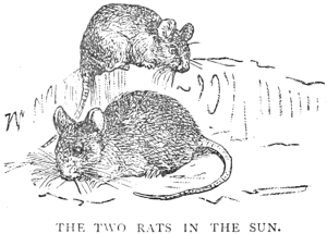 “The young rat said he must travel off somewhere and hear how it all happened, and he and the frog set out together and travelled. Sometimes the young rat let the frog ride on his back, because he could go faster by runs than the frog could by leaps. The rat could not go frog-back, because it was so hard to keep on. When they had travelled a long way they met a mother rat, with her baby in her mouth, running as fast as she could go.