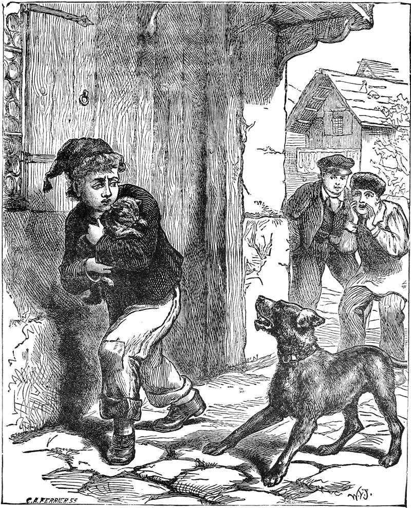 “The ground was covered with snow, slosh and mud. I had been running hither and thither, under barns, in coal cellars, and in other places trying to catch something, but having had the misfortune, as I have already told your ladyship, the misfortune of being born short-clawed, I had caught nothing. Begrimed with dirt, hungry, cold, forlorn, I was on my way to my jumping spot. This was the corner of a wall near a back door. It was also near to some bushes and trees all snugly fenced in, and under these I had often hid myself and tried to clean my fur and watched for the back door to open. I called it my jumping spot because sometimes I jumped from that spot and got in at the back door and snatched a bit from the plate of the cat which belonged to the house. Sometimes a kind maiden had thrown me scraps from one of the windows.