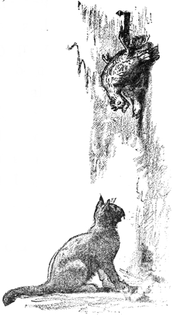 “As for squirrels and rabbits, they seemed at last to be not a bit afraid of me, even when I had become a full-grown cat. One saucy squirrel used to tease me by coming very near and then darting out of my reach. This squirrel became very bold. He even popped in at the doors and windows. One day when I was asleep on the sofa by the library window, he ran as near me as the back of the sofa—bold little thing! and by the time I had turned over he was out of the window, and I soon got sight of his bushy tail whisking through the tall tree-tops, and of his little bright eyes looking down at me through the leaves. He would not have got away so easily from the next house cat. There can be no doubt but that I must have been born short-clawed.