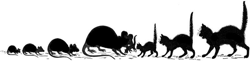 “The three cats walked in procession with the baby in front, and their oldest sister walked after them all, and the three rats walked in procession with their baby in front and their oldest sister walked after them all. But when they came in sight of each other, the rats were afraid of the cats and went behind their oldest sister. The oldest sister of the rats then took the baby cat in her mouth, and the cat procession started, and when the oldest sister of the cats came to the baby rat she took that in her mouth and then the rat procession started, and both processions walked away, and the baby rat is now staying with the cats, and the baby cat stays with the rats, and all is well. We do not have to hide in holes and under floors and behind walls, and our children will all live to grow up, unless they get sick from eating poison, as my baby did.