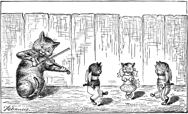 “After this song and others were sung the kittens who came to dance a jig, danced it. Their mother played the fiddle well, and they danced their steps well and gave much pleasure to all present. All present were happy in the peace and no doubt the peace would have lasted to this day if the rabbits and the hens had not broken it up.