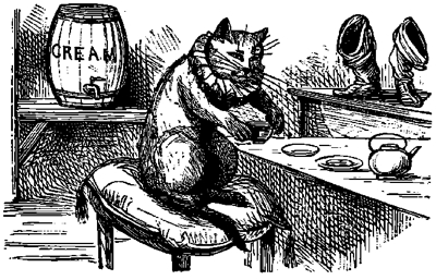 “The cat that ran away with the Pudding-Bag String was known to think not very well of the peace and she was asked to go and speak to the Lion. She said she would go, but must first borrow her grandmother’s boots of swiftness. Her grandmother was just taking her tea and felt very well. She said she was not using her boots and was willing to lend them if they could be taken good care of. The cat that ran away with the Pudding Bag String put them on and went to speak to the Lion.