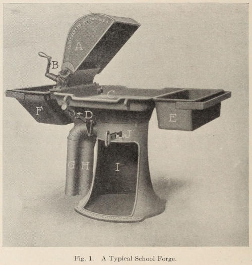 One of the most essential things in the school forge shop is a good forge and fire; half the work is then mastered. A few years ago nearly all of the small commercial shops running from one to six or more fires were equipped with brick or iron forges. The blast was furnished either with a bellows or fan which had to be turned by hand. This method was a great drawback, which resulted in much loss of time. It was impossible to do much work without the aid of a helper. Work that required two men in those days is being done now by one. Modern invention has played an important part in simplifying the labors of the workers in iron and steel. At the present time there are various kinds of forges in use that lessen the work of the smith. The most successful factories are now equipped with modern forges and appliances in order that they may be able to do work quickly.