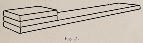 Figure 18 shows a wrought vise suitable for school work. A cast iron machinists’ vise should not be used excepting, perhaps, for bench work. Figure 19 shows a cast-iron swage block with various sized holes, and depressions around the edge for forming iron.