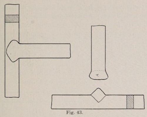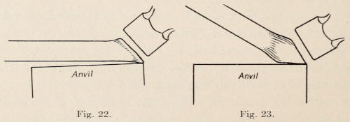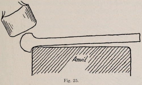 Iron and steel are sometimes smoothed with a tool called a flatter. This tool is struck on with a sledge, and should not be used to stretch iron. Its purpose is only to give the work a smooth finish. Figure 13 shows a flatter, and Figure 14 a set-hammer. The set-hammer is always used to smooth and draw stock. All of these tools are made from tool-steel.