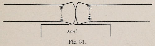 Welding is also done with an electric welding machine. The pieces to be welded are clamped and held in bronze clamps. The clamps are adjusted so that the ends of the pieces to be welded touch. They can be moved so as to bring the pieces into close contact or separate them. When the pieces are in close contact, the current is turned on. The pieces are then separated a little so that the current jumps across the space between them, forming an electric arc. This heats the[23] ends to a welding heat, and by forcing them together they are welded.
