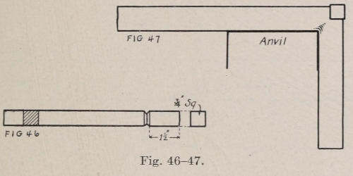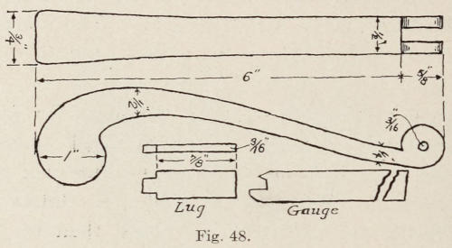 At Figure 46 is shown a door knocker hinged at the top. The plate is one piece. At Figure 47 are shown the dimensions of the plate. After the shape of the plate is sketched on the metal, the lines are traced with a chisel. The open work is then cut out, and the outside of the plate is cut and filed. The center leaf at the top of the plate is indicated by forcing the metal down along the top edge of the leaf with a punch, also[116] at the bottom to form the interlace. The plate should be hot when this is done. The hammer shown in Figure 48 should be forged from ¾-in. square, soft steel. The lug shown on the drawing is to be made and riveted into the top of the plate. The hammer is then placed over the lug, and the lug is drilled to conform to the drilled holes in the hammer.