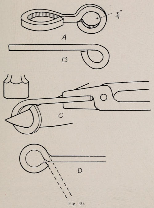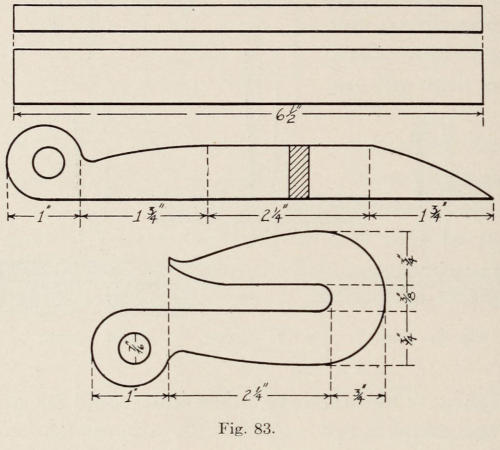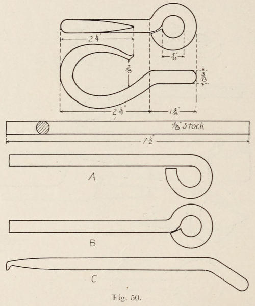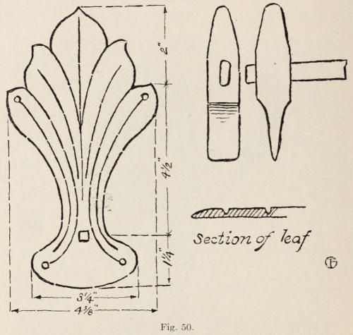 Figure 49 represents a hat-and-coat hook. In the making of this piece, the plate should be made from No. 14 soft steel. The dimensions are shown in Figure 50.[118] The shape of the plate can be drawn on heavy paper, which is afterward cut out and used as a pattern when making the plate from metal. After the plate is cut out with a cold chisel, it is ground or filed on the edges. The holes are next drilled, and the lines are cut on the surface as shown in the drawing. In cutting the lines, a short, narrow cold chisel is used for chasing in the same manner as previously described. The lines on the leaf should be made quite deep. A fuller is shown in Figure 50, which is used to make the lines still deeper. The fuller should have the edge smooth, and without sharp corners. The plate should be clamped on to a surface plate while making the lines.[119] The fuller is then set on the cut lines and struck with the hand hammer, chasing the tool to the ends of the lines. This work can, also, be done to advantage by heating the plate and having a helper hold it on the anvil while fullering the lines. When all the lines are made, the leaf is heated, set on the elm block and hammered on the back to raise the end of the lobes as shown in the illustration.