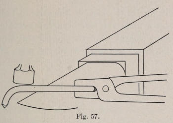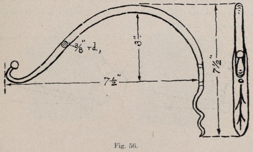 A wall hook, suitable to hang a bird cage or fern dish, is shown in Figure 56. In Figure 57 are shown the length and size of stock, and the piece ready to form. In making the ball, the piece is shouldered at one end by hammering it on the outer edge of the anvil as shown[123] in Figure 58. It is then hammered on the corner, to make it round. The other end is drawn to a square point, and is then flattened as shown in Figure 59, letting it become as wide as it will. This flat end is then veined suggesting a leaf form. In doing this, a long chisel, made round somewhat like a fuller, is used. The piece is heated, and a sunken line is made with the chisel, as shown by the drawing of the leaf end. The piece is then heated, and the leaf end is formed. The holes should now be drilled. The balance of the hook is heated and formed by hammering it over the horn of the anvil.