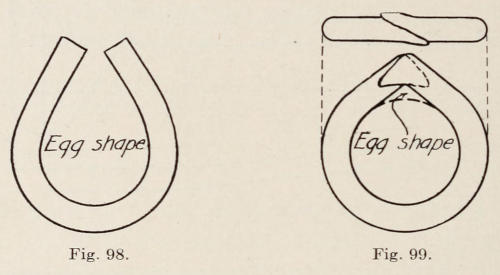 The best forge for manual training and trade schools is the down draft with power driven fans, thus[8] eliminating all pipes overhead and doing away with the dust and dirt. A boy, working at this kind of a forge, can use both hands in the handling of the work being heated in the fire; this is a great advantage over the old way of turning a crank. Another good feature of the mechanical draft forge is that it teaches a boy early how to avoid over-heating or burning his iron. This is the first thing one must learn in working at forging, as one who cannot heat the metal properly cannot work it. One must become acquainted with the material, and the burning heat must be understood.
