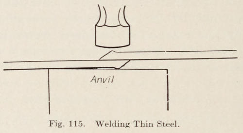 If two pieces of iron are placed in the fire and heated, they will become gradually softer until they reach a state where the metal has become sticky. If touched together the two pieces will stick. This is what is known as welding heat. If they were taken to the anvil and hammered while in this condition they would unite and become one piece. This would be called welding. All metals cannot be welded. Iron, soft steel, low-carbon tool steel and spring steel can be welded.