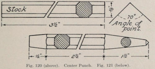 A center punch is used to make depressions in metal so that a drill may be started in a given place. It is used also to mark places or distances on the surface of metal when the metal is to be bent at a certain place. Center punches are made from hexagonal tool steel about 4 by ½-inch, drawn to a point and ground to a short angle. (See Figure 10.)