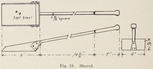 Figure 1 shows an illustration of a down draft forge suitable for schools; it is made of cast iron. A pressure fan furnishes the blast for the fire and an exhaust fan takes away the gas and smoke thru an opening at the bottom of the hood, and thru a large pipe which continues under the floor and out thru a flue. The hood represented at A, can be moved backward and forward to catch the smoke. The hood is moved with a crank and worm gear as shown at B. The hearth is shown at C; a hole in the center is called the tuyere. This is where the fire is built and is the outlet for the wind. The amount of air needed for the fire is regulated by a valve that is moved with a rod shown at D. The coal box is always at the right hand of any forge and is shown at E. The water box is represented at F. At G is shown the pressure pipe and at H the exhaust pipe. Notice the large opening under the forge at I. Thru this opening any nut or screw under the tuyere can be tightened with ease. Notice the slide-rod at J. This rod, when pulled, dumps the cinders out of the tuyere, and a bucket may be set under the hearth to catch them.[10] In school shops these forges are generally set in pairs in order to save room. Figure 2 shows three fire-tools needed for the forge fire. These tools consist of a poker made from ⅜-inch round stock, 26 inches long with a loose eye turned on one end for a handle; a shovel with a flat blade 4 by 6 by ¹⁄₁₆ inches with a handle riveted to the blade, and a tool called a scraper. This scraper is made from the same stock as the poker and is made with an eye at one end and a flat hook at the other. It is used to scrape the coal and coke onto the fire, and to move pieces of coke or coal, so that the iron may be seen while heating.