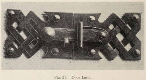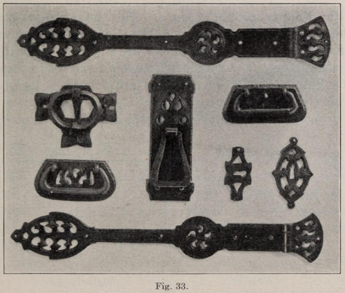 In Figure 45 is shown an interior door knocker. It is backed up with colored leather. The plates are made of ⅛-in. thick, soft steel. After the plates are cut out, the openings are marked with a slate pencil and gone over with a short cold chisel to mark them. The plate is then heated, and the part enclosed by the chisel line is cut out. A very narrow chisel, 12 in. long, is used to do the cutting. The cutting is all done from the outside. This gives the edge a slight bevel. The edges of open places are trued up with a file. The openings must not be filed too exact and smooth. The most essential thing to look[114] after is form; the work looks best when it shows handwork and is not mechanical.