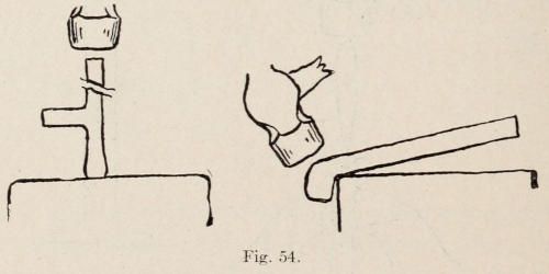 After the handle is shaped, and the holes are punched, including the one at the top to hang the fork by, the line to receive the copper is marked. (See Figure 63.) The marking should be done with a scratch awl. The line is then cut with a small chisel. This cutting should be quite deep and exact. This is important if the work is to be true and straight. All of the marking should be done while the handle is cold. It is now heated and taken to the anvil. A small punch, as represented in Figure 63, is then set onto the cut line and given a blow with the hammer, sinking the punch about ¹⁄₁₆ of an inch. One-half of the punch is now raised up and out of the channel. While it is directly on the chased line, it is given another blow with the hammer and so on until the end is reached. The particular thing to watch is to have the lead corner of punch directly on the chased guide line, while the other edge of the punch is in the channel in order to keep the finished line straight. Keep the punch in good order, straight and square at the end. The punch should not have much taper and should not be used after the red heat leaves the metal. After the entire line has been sunken ¹⁄₁₆ in. deep, the handle is reheated and the line is sunken perhaps ⅛ in. deep.
