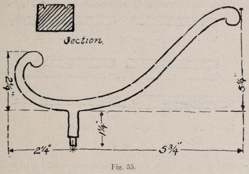 The hook is made from iron. Figure 51 represents the dimensions of stock for the hook. The lug is welded on, and the ends of the bar are rounded ready to be formed. After the stock is cut, it is upset six inches from one end to enlarge it so that the lug can be welded on. The stock from which the lug is made is cut 3½ inches long, upset on end, and split in the vise ½ inch deep as shown at Figure 52. The split end should be formed as shown. In welding, separate heats are taken, and the lug is jumped onto the bar as shown in Figure 53. The first blows are struck directly on the end of the lug, then the lips are welded. Figure 51 shows the length[121] of the piece before the knobs are formed. In making the knobs at the end, they should be upset as shown in Figure 54. They are then hammered as shown, and finally rounded. The lug is next cut the proper length, and a shoulder is filed at the end. The chased lines are now cut on the front side. In forming the piece, it is heated and hammered over the horn of the anvil,[122] starting to bend at the end first, and working toward the center. In bending anything of this kind, always start at one end, and finish as you work toward the other end. See the drawing of the bent hook at Figure 55. The end of the lug is next heated and caught in a vise, the plate is set on and riveted tightly. The work is smoothed with a file, heated to darken it, and oiled.