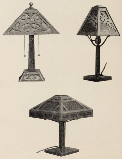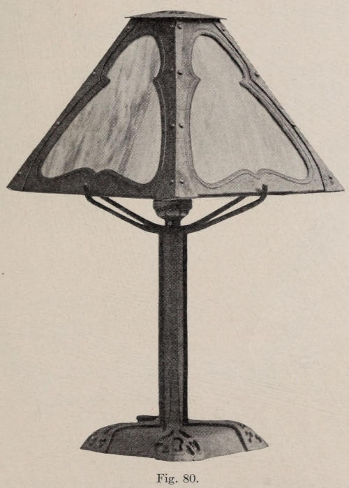 In Figure 80 is represented a portable lamp. This kind of lamp can be made in various sizes with one light. The lamp shown in the illustration, consists of two parts; the standard, and the shade, which can be removed. The standard consists of a box-shaped bottom, with a pipe screwed into it for the upright piece. The arms that the shade rests on, are separate[140] and are held in position by the lamp socket, which is screwed down on them. The strips running over the bottom of the base and up the pipe are riveted in place to support the pipe. This gives the whole standard a more substantial appearance, and relieves the plain round pipe.