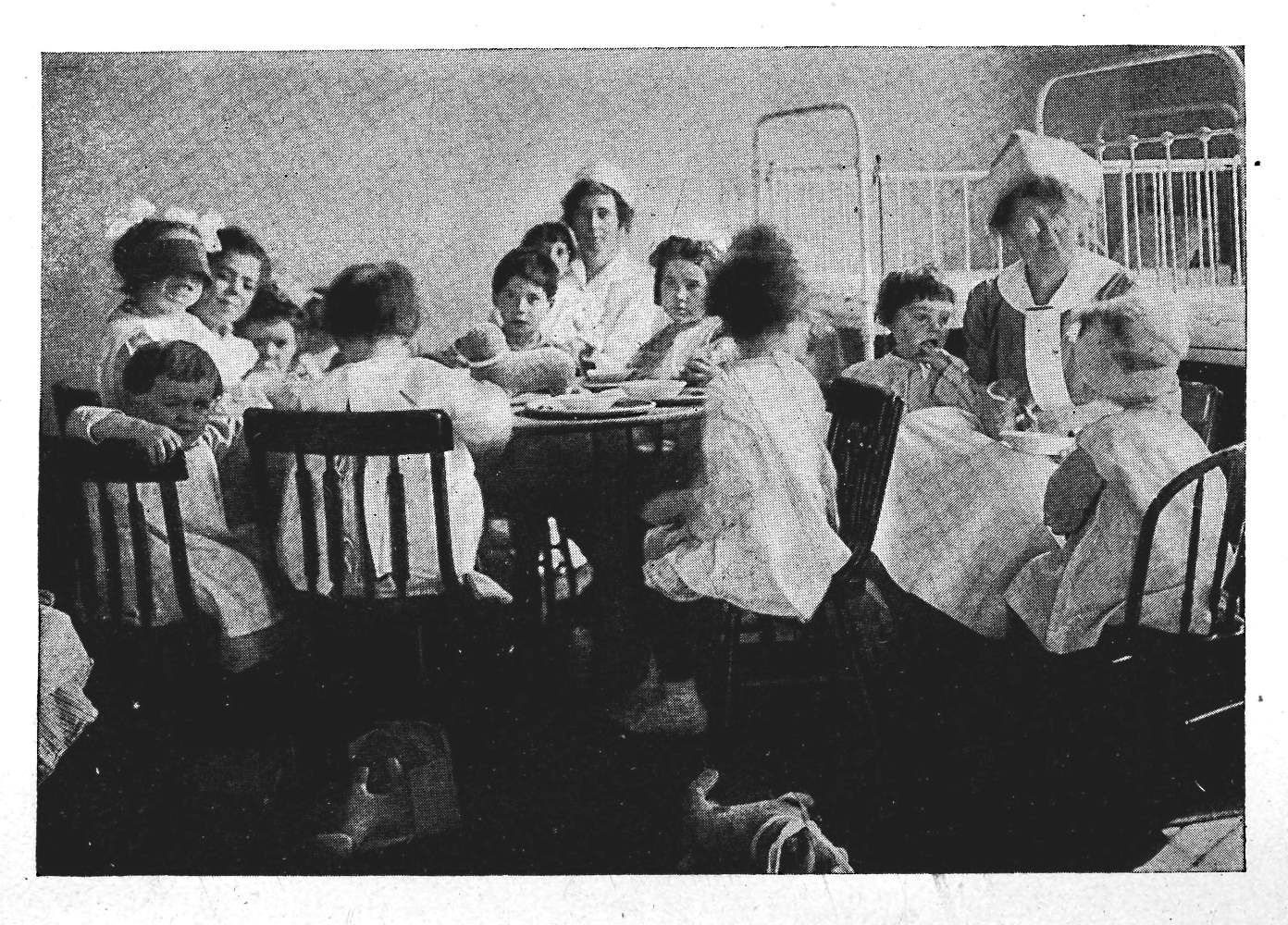After dinner the children put back their chairs nicely, and then the victrola played lovely music. It was pleasant to see all the little children stand at salute when they heard the Star-Spangled Banner. Even the deaf ones did as they saw the others do.