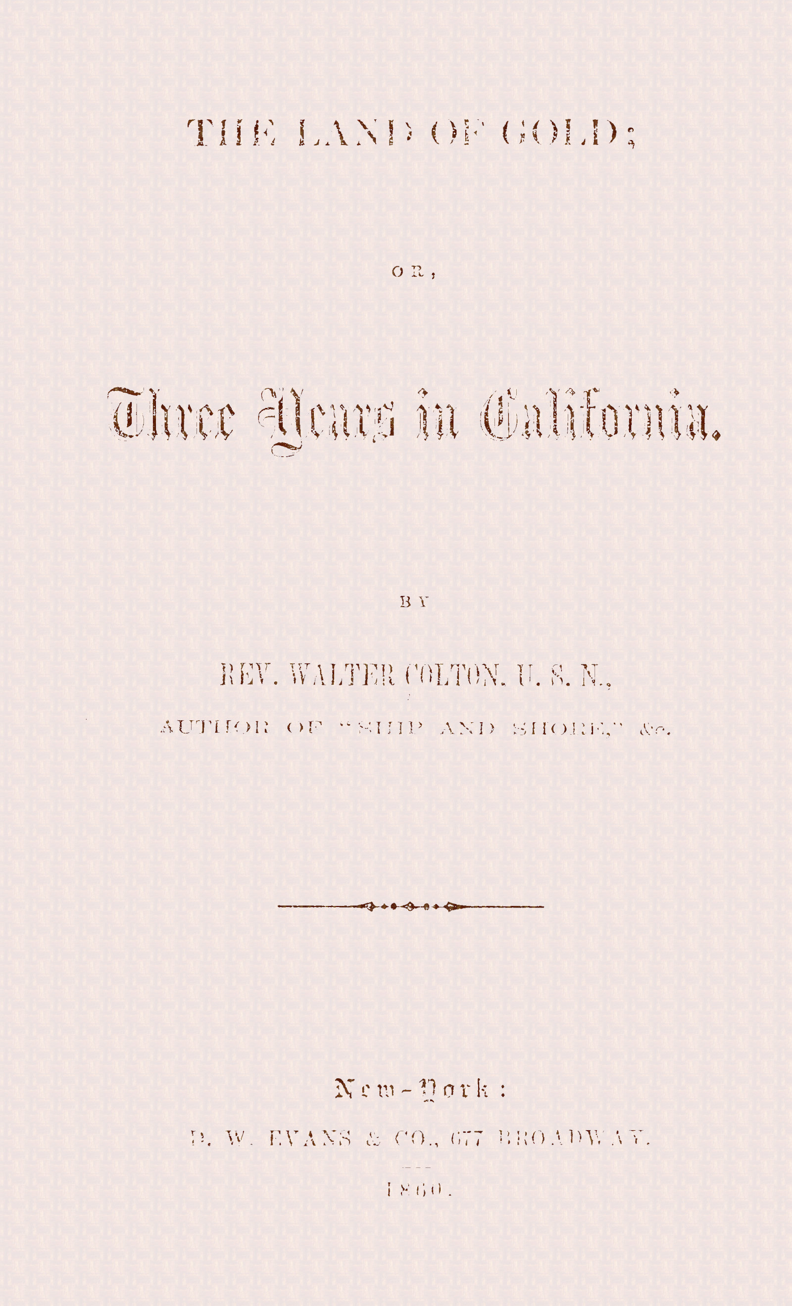 Many events of moment occurred in California during my residence of three years in that country, and which were sketched in a journal kept by me at the time. They are interspersed with anecdotes and incidents of a less general concern, but which may not be without some interest with the reader, as affording a clue to the leading features of society, and traits of individual character. The circle of engaging objects in a community, just emerging into the refinements of civilization, is never broad; but every phase in the great change going on possesses an intense individuality, and leaves its ineffaceable impression, like a ship sweeping a solitary sea, or a bird scaling a sunset cloud. California will be no more what she has been: the events of a few years have carried her through the progressive changes of a century. She has sprung at once from the shackles of colonial servitude to all the advantages and dignities of a sovereign state.
