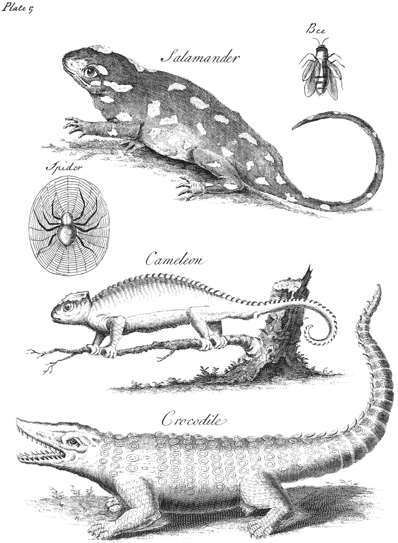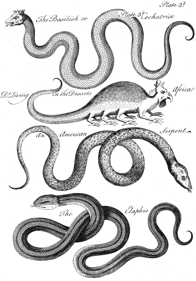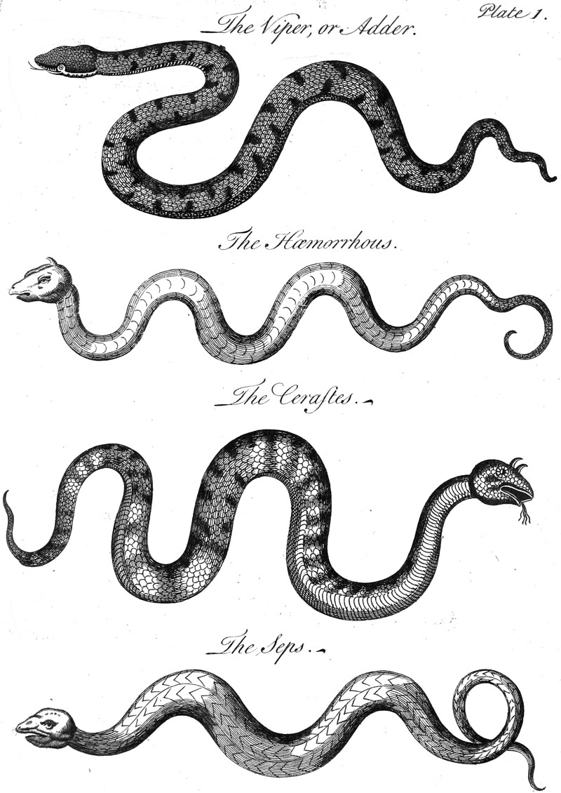 They are painted with variety of Colours, as red, black, white, brown, green; the Composition of these, in some of their Garnitures, forms Beauties exquisitely fine. Some of them have very little Eyes, others large ones: Some wound with their Teeth, 3others with the Tail that terminates in a Sting, which is an Apparatus in the Body of certain Insects like a little Lance, serving them as a Weapon of Offence. Mention is made by Historians of harmless Serpents, and of Persons who have tamed Serpents, and whose Hair has been kissed by a tame Dragon, and which, with its Tongue, gently lick’d its Master’s Face[4].