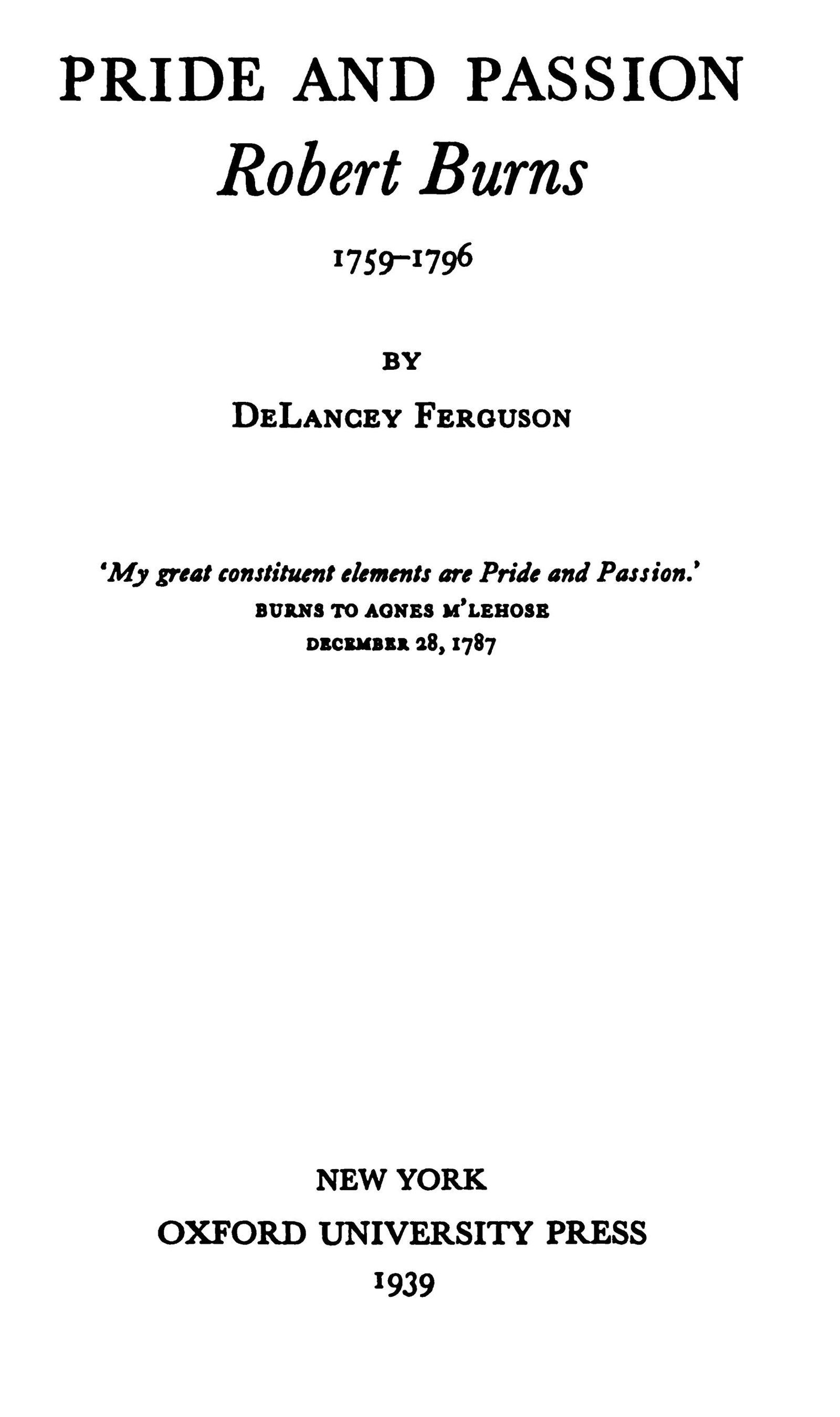 Lest British readers charitably assume that I sin through ignorance, I ought perhaps also to add that in writing of Burns’s world I have not hesitated to equate some of its social and political aspects with their twentieth-century American analogues. To describe a dead world in dead terms seems a poor way of revivifying it. My omission of footnotes is likewise deliberate. In a score of articles in various journals during the past decade I have presented, and fully documented, the evidence on many controversial points. The articles evoked an almost passionate apathy; nevertheless they, and their footnotes, are there if anyone cares to look them up. Furthermore, nearly all the source documents I have used are now in print, despite the efforts of Burns’s self-appointed literary executors to suppress certain of them. On two points I recant some of my earlier statements: I know now that the circumstances of Burns’s quarrel with the Riddells are not so clear as I once thought them, and Mr. Stanley Cursiter of the Scottish National Gallery has given me reason to doubt my identification of the miniature portrait belonging to Mr. Oliver R. Barrett.