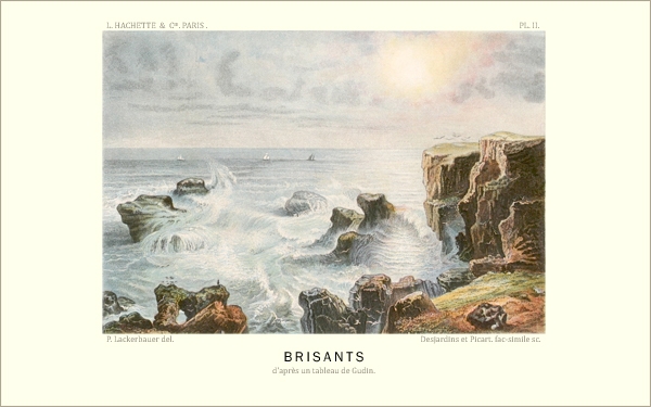 Près des côtes où de fortes marées agitent un fond vaseux ou sablonneux, la teinte de la mer devient plus ou moins grisâtre; mais, quand dans les eaux les plus pures et les plus calmes, la couleur jaunâtre du fond se laisse voir à 7 travers l’azur du liquide, il en résulte une teinte verte que les rayons du soleil nuancent quelquefois de reflets brillants, comme les feux de l’émeraude et du saphir.