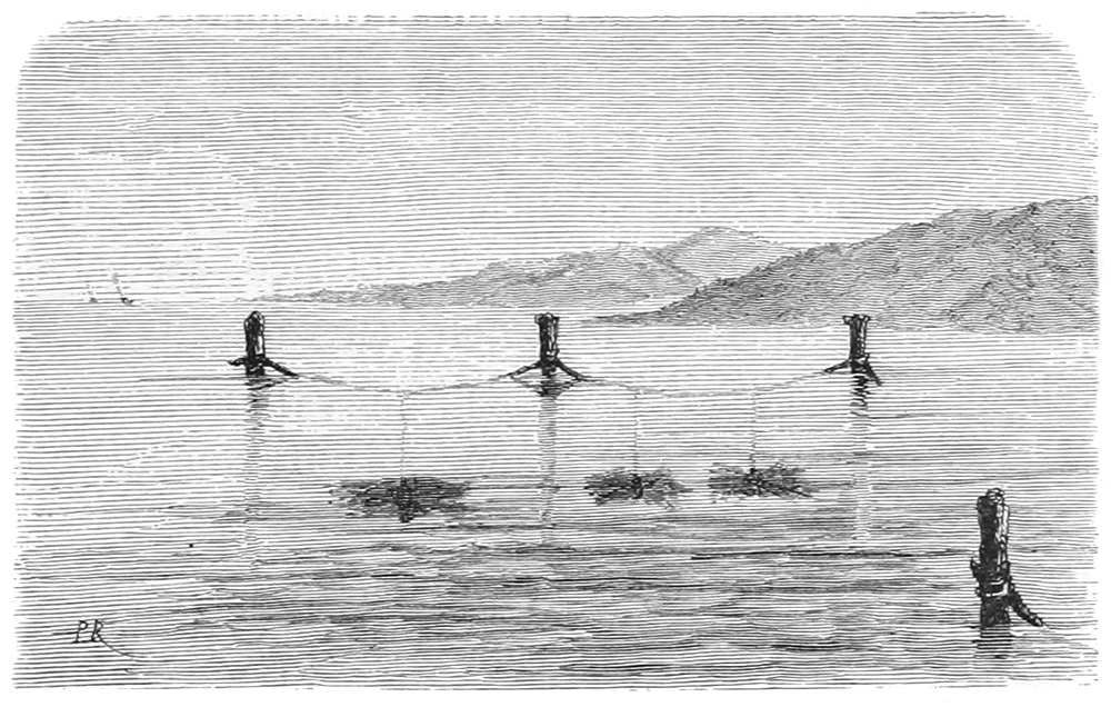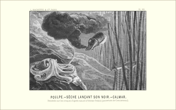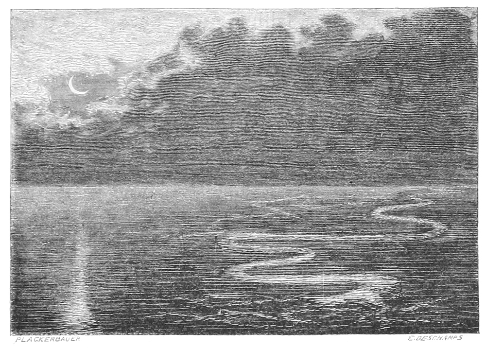 Quand on descend dans l’Océan, on voit s’évanouir peu à peu les teintes azurées. A l’éclat du jour succède une lumière douce et uniforme; bientôt, on entre dans un crépuscule rougeâtre et terne; les couleurs se fondent, s’assombrissent, et l’on arrive par degrés à une nuit profonde.