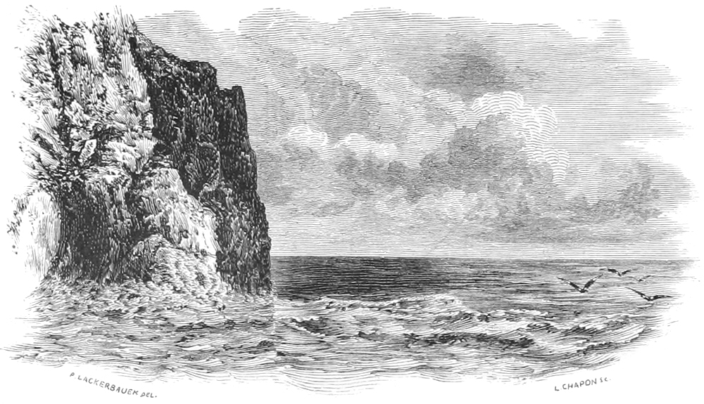L’océan Atlantique commence au cercle polaire arctique et arrive jusqu’au cap Horn. Il est situé entre l’Amérique, l’Europe et l’Afrique. Il présente une longueur d’environ 9000 milles, sur une largeur moyenne de 2700. Il couvre une surface de 25 millions de milles carrés. Il est situé entre l’ancien et le nouveau monde. Au delà du cap des Tempêtes, il n’est plus séparé que par une ligne imaginaire des vastes mers du Sud, immenses plaines où prennent naissance les ondes qui sont la principale source des marées, et qui se propagent en grandes vagues à travers l’Atlantique. (Maury.)