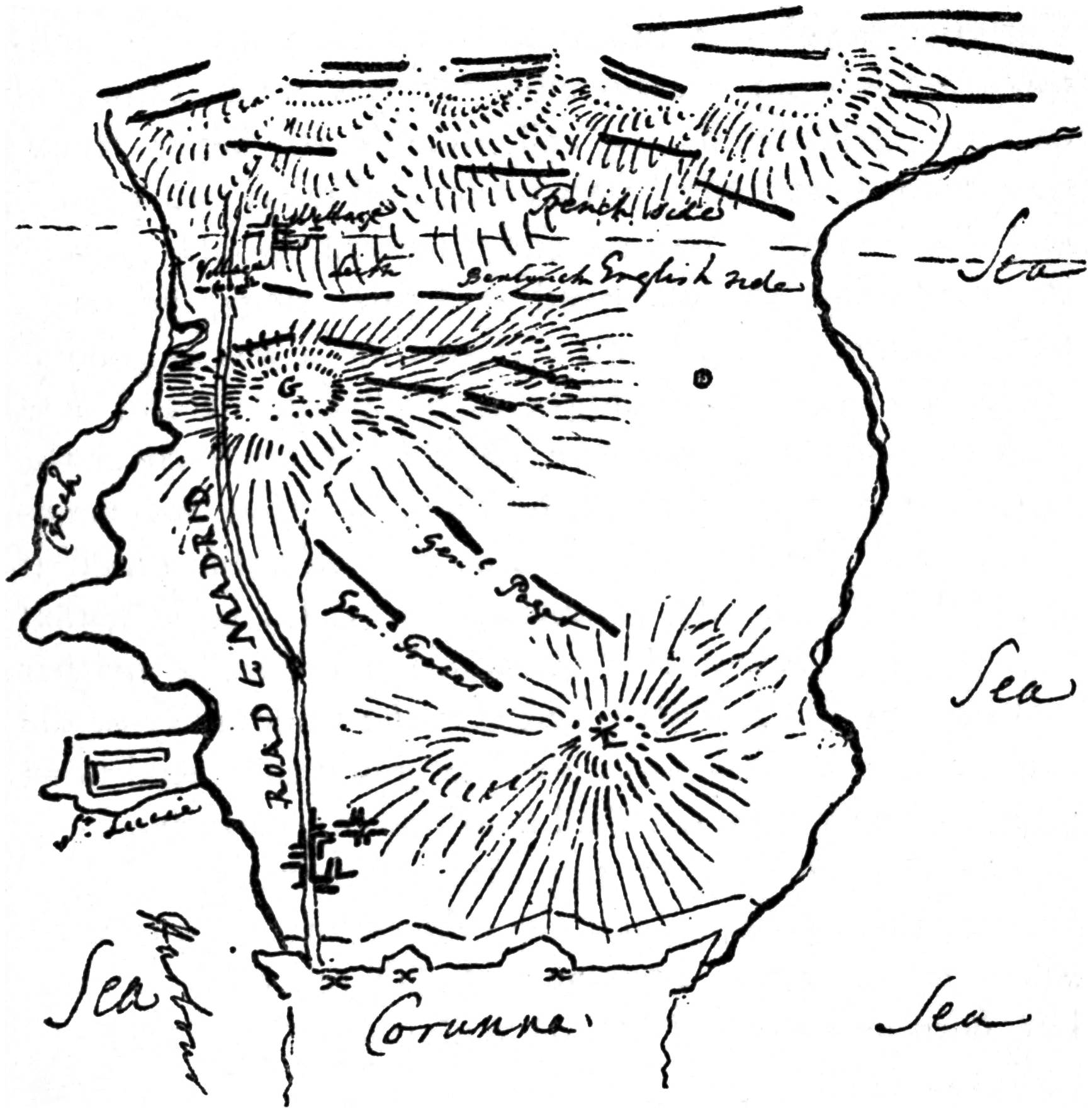 The brigade of Major-General Beresford, which was281 alternately to form our rearguard, occupied the land front of the town of Corunna; that under Major-General Hill was stationed in reserve on the promontory in rear of the town.