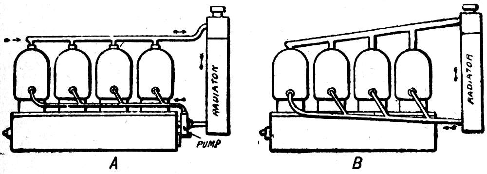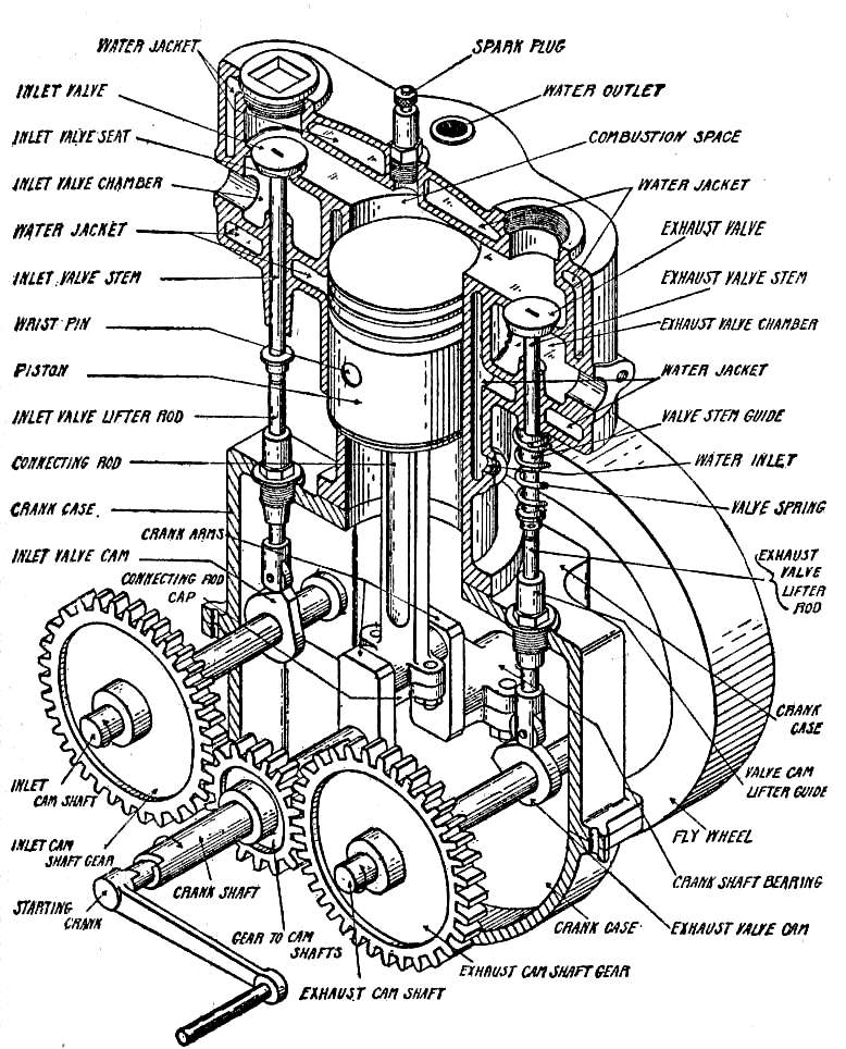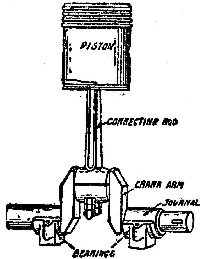 Crank shaft—Crank-shaft bearings—Relative position of cranks—Connecting rod—Wrist pin—Piston and piston rings—Automatically and mechanically operated valves—Cams and cam shaft—Secondary shaft—Two-to-one gears—Valve-lifter rod—Valve locations—Muffler—Engine cooling—Cooling by Water—Pumps—Radiators—Pressure and gravity systems—Cooling by air—Lubrication 20-36