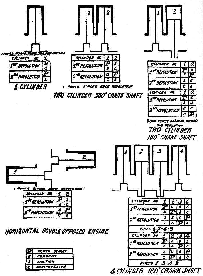 Vibrations of engine—One-cylinder engine—Horizontal double-opposed—Two-cylinder vertical—Four-cylinder—Firing order—Balance of three- and six-cylinder engines—Comparison of engine types 37-46