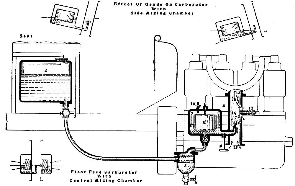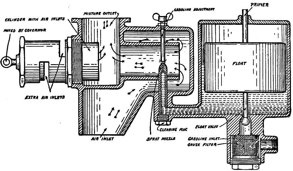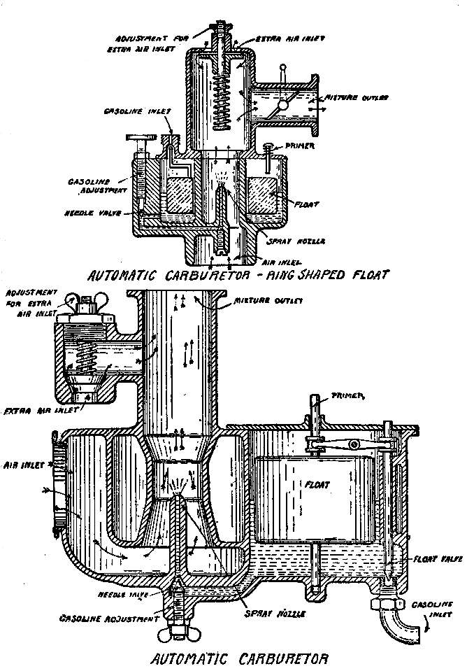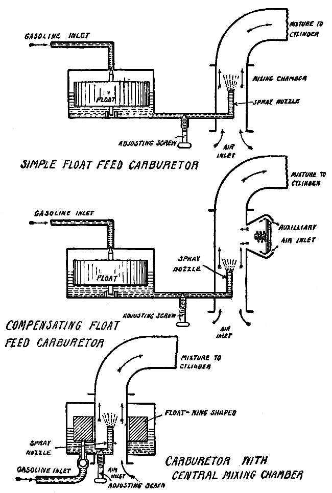 Carburetion—Carburetor—Carburetor parts—Carburetor action—Necessity for auxiliary air—Auxiliary air inlet—Automatic and mechanically controlled air inlet—Carburetors with side and central mixing chambers—Mechanically controlled carburetor—Surface carburetors—Gravity feed—Pressure feed—Check and relief valve 52-73