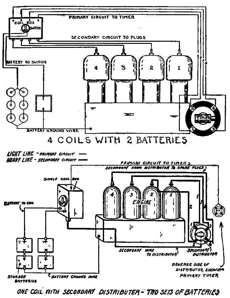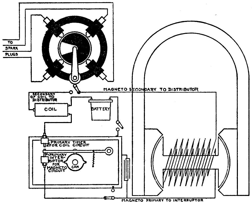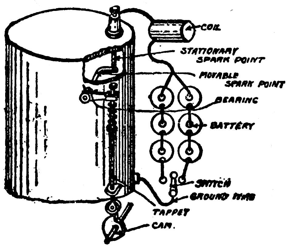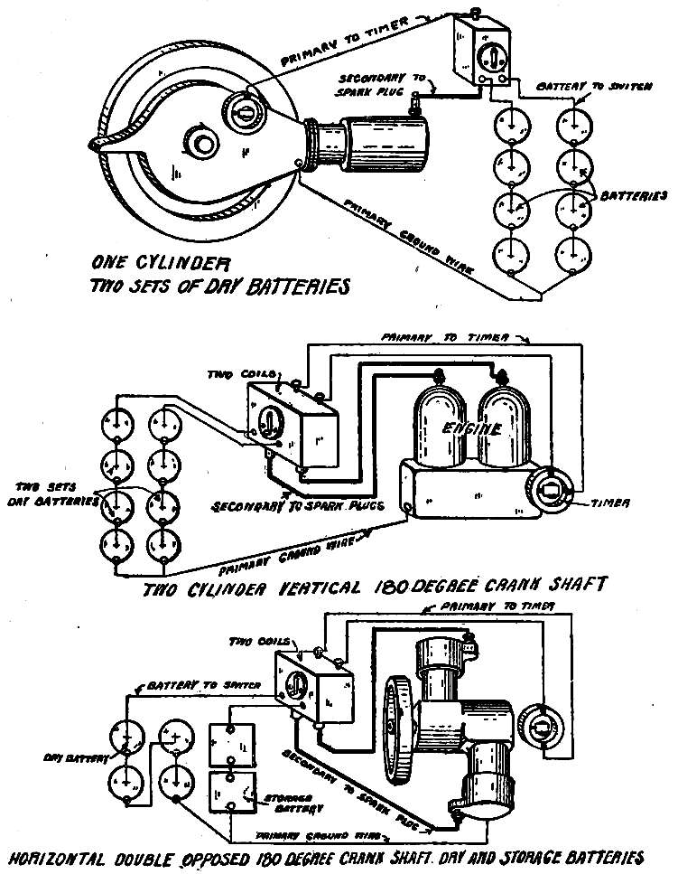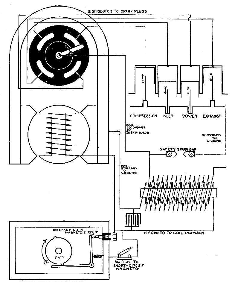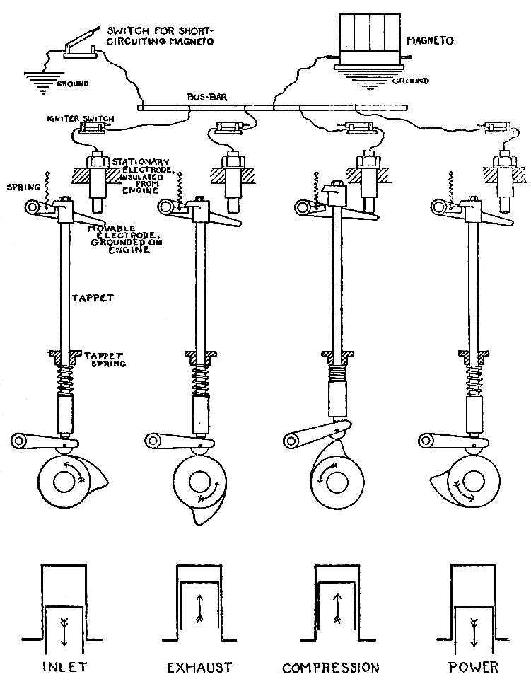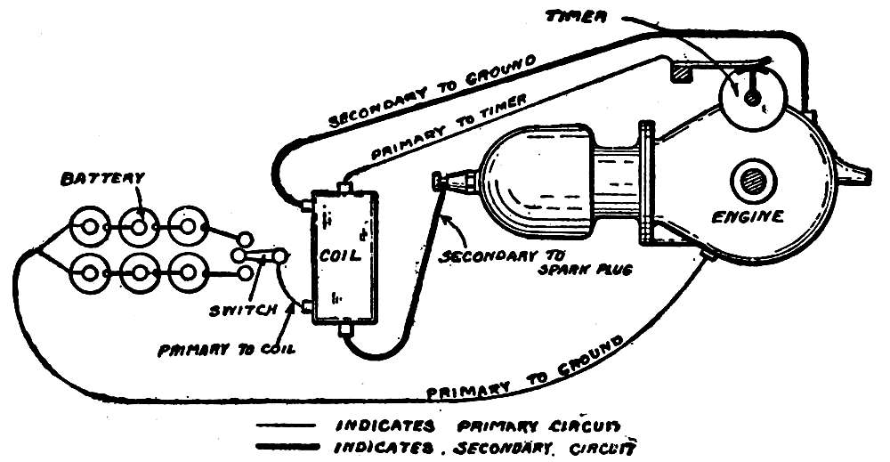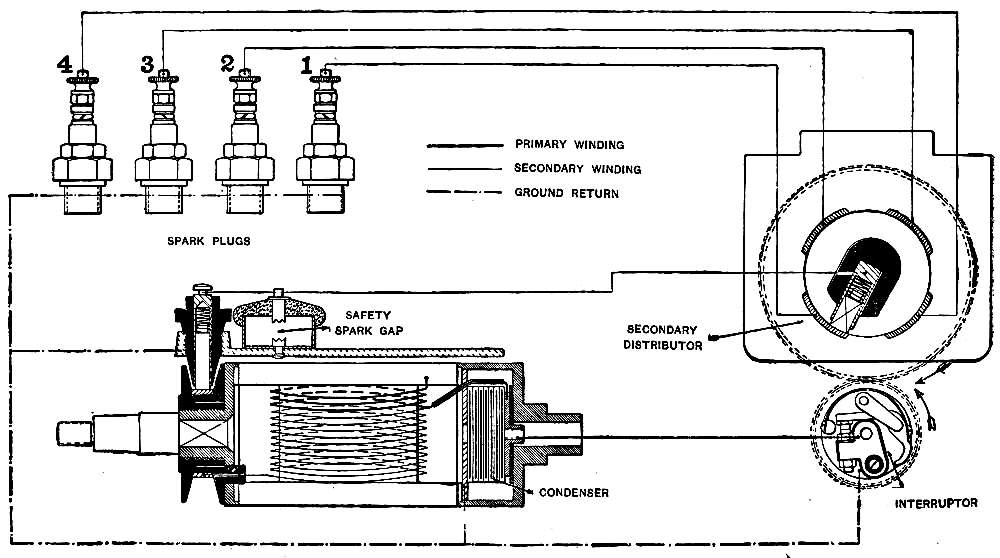 Ignition systems—Make-and-break system—Igniter—Tappet—Connections—Primary induction coil—Action of coil—Induced current—Magneto—Jump-spark system—Secondary induction coil—Primary and secondary circuits—Timers—Mechanical and magnetic vibrators—Spark plug—Circuit—Condenser—Secondary distributer 91-111