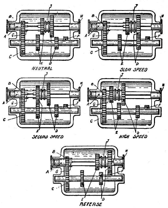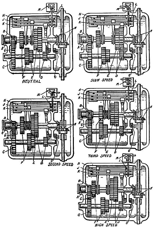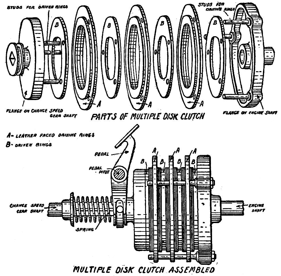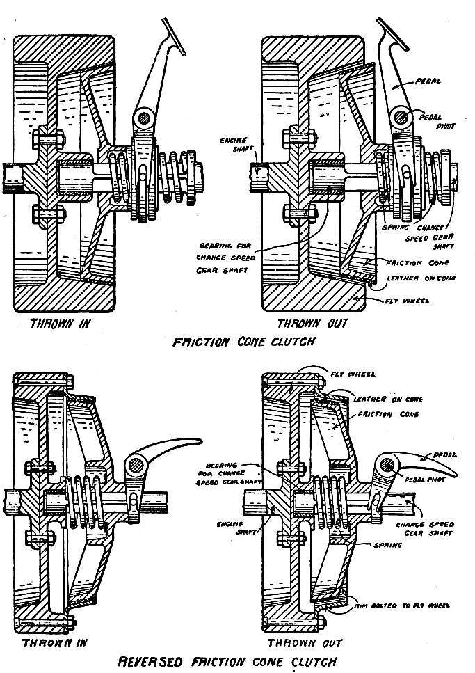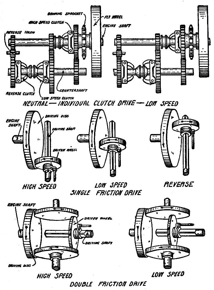 Transmission parts—Clutches—Friction-cone clutch—Reversed friction-cone clutch—Multiple disk clutch—Internal expanding clutch—Change-speed mechanisms—Sliding gear: progressive and selective types—Use of clutch in changing gear 112-131