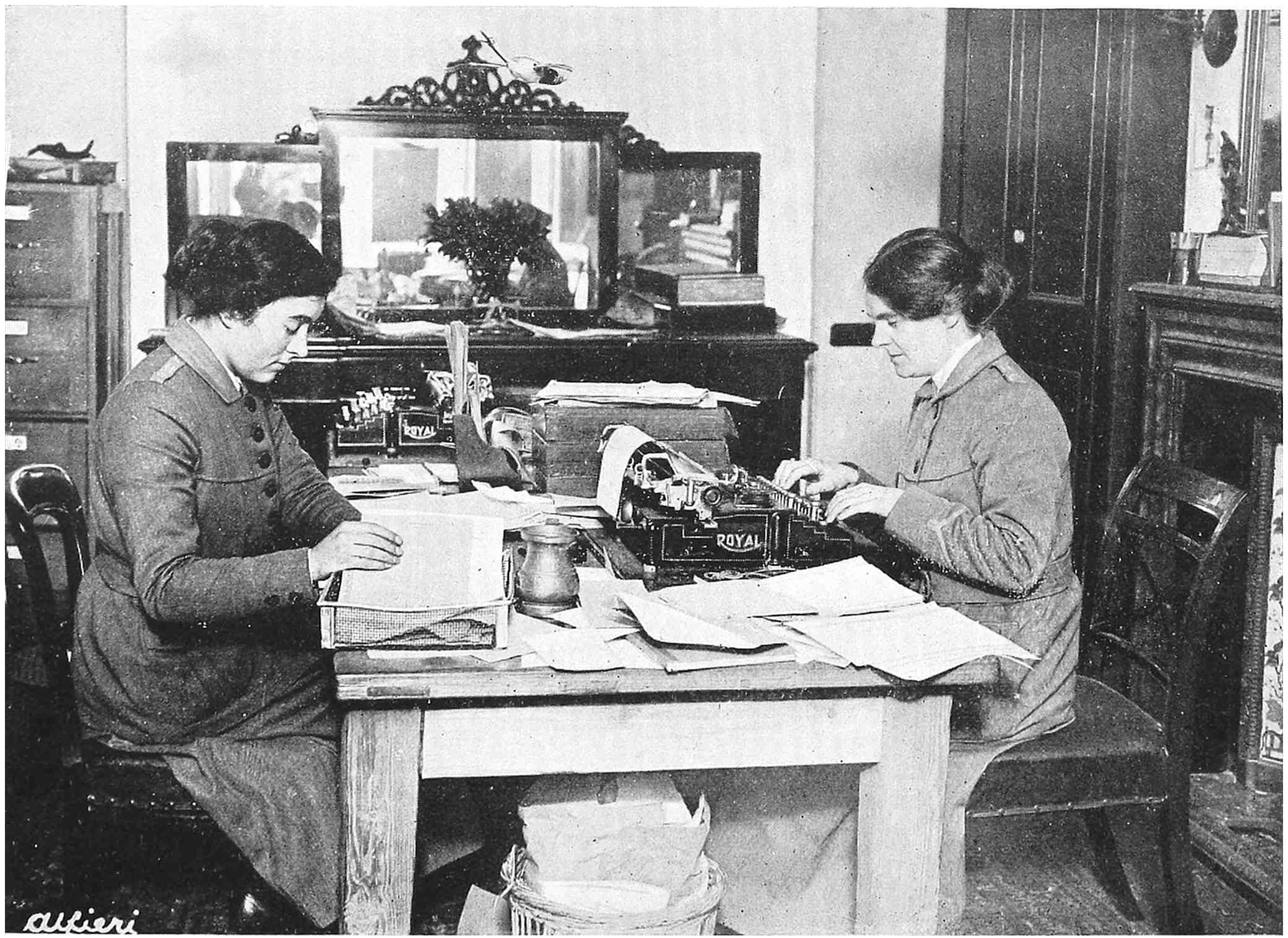 A strenuous attempt was made to obtain better terms for clerks, for the pay given to them in 1915 was not a living wage. Twenty-five shillings a week was considered enough for shorthand typists; and a colonel who was interviewed on the subject refused assistance on the ground that ‘the girls in his office got no more, and they looked alright.’ After weeks of letter writing, the pay was raised to twenty-six shillings, with overtime at ninepence an hour; and gradually it was pushed up for all grades of Government clerks. When a bonus for clerks was introduced, the men received four shillings a week and the247 women two shillings, although they were doing the same work. The weekly salary finally reached thirty-nine shillings and forty-five shillings, but the rate was always below that paid by civilian employers, and the Government was in the position of exploiting the patriotism and generous feeling of the women who worked for it.