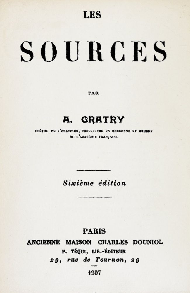 Le public ne cesse de demander deux opuscules du Père Gratry, intitulés, le premier : Les Sources, Conseils pour la conduite de l’Esprit ; et le second : Les Sources, ou le premier et le dernier livre de la Science du Devoir.