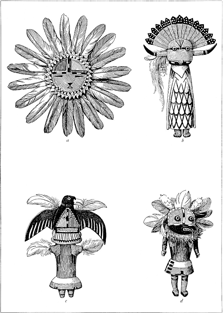 Returning to the common symbol of the sun, or the disk with painted design and radiating peripheral eagle feathers, we find on comparing it with the symbolism of the head of a sun god (plate XXV, b), a close similarity. Among the features common to both are the markings on the upper half of the face, the radiating feathers, and the cross extensions. The marks on the sun disk, indicating eyes, are here replaced by balls, but of greater importance in future comparison, the mouth or double triangle is represented by a curving beak. The reason for the substitution of this form of mouth is apparent in a comparison with the head of the doll of Kwátaka (plate XXV, c), where a bird’s head, wings, and tail are all represented. The symbolic design on the body of this bird doll is strictly comparable with those on the two sun symbols previously mentioned. The radiating feathers are replaced by tail and wings, while the head is suggested by the curved beak of the second symbol. A comparison of these three figures leads to the belief that they are three different sun symbols.