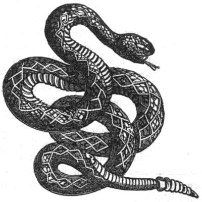 This terrible serpent is found in the province of Ceara, whence it was brought to Rio Janeiro. This species generally attains a length of from four to five feet but the animal from which the poison was taken for our provings, was three feet long. Its oval-triangular head one half of which is provided with shields, shows a round depression in front of the eyes, which are covered with a large elliptical shield, serving as a lid. The body is big, conical, its movements are sluggish; its upper surface is covered with scales, the dorsal scales being keeled and somewhat lanceolate, the scales of the tail being quadrangular and smaller. The belly is provided with one hundred and seventy large transversal plates; there are twenty-five plates belonging to the tail, the three first of which are divided in shields. The extremity of the tail is furnished with seven or eight capsules of the consistence of parchment which, when agitated, produce a shrill sound. The color of the crotalus is a yellowish-brown, much lighter under the belly, with twenty-four or twenty-six regular long rhomboïdal lines on each side of the back. When irritated and during the excessive heat, the crotalus spreads a very fetid musk-like odor. The molar teeth which are few in number, but long and excessively poisonous, are inserted in exceedingly dilatable jaws. Every body knows that the poison of this reptile acts with a frightful intensity; and it was not without great danger that Doctors Mure and Martins succeeded in obtaining a few drops of it, by compressing from the living animal the gland which secretes it.