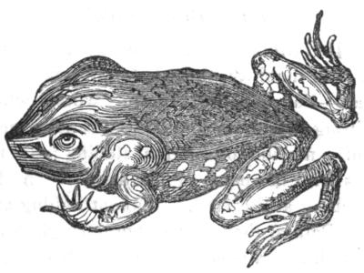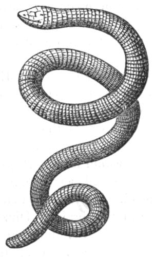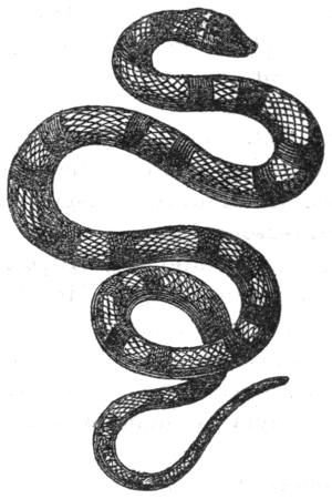The elaps corallinus is found quite frequently in the woods all along the coast of Brazil, and its bite is much dreaded. Its colors are more brilliant and more agreeably combined than those of any other serpent in Brazil. Its head is small, covered with large polygonal scales; it swells behind and is continuous with the neck from which it is scarcely distinguished as regards size. It has round and small eyes; the jaws which are little dilatable, are furnished with sharp teeth accompanied by fangs that rest on the venomous glands. The body is about two feet and a half in length; it is round, rather big in proportion to the head, and terminates in a sharp tail. The upper part is covered with smooth rhomboïdal scales; the belly is covered with two hundred transverse shields; the tail numbers fifty shields, which are disposed in two parallel rows. Its colors are disposed in the shape of rings of a vermillion-red, alternating with black rings, each two rings being separated by circular lines of a greenish white. The upper part of the head is black; likewise the first colored ring of the neck; the[23] shields of the jaws are white, and are separated from each other by black lines. As in the case of the crotalus cascavella, the poison was taken from the living reptile, not without danger.
