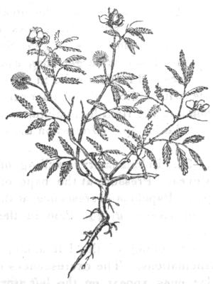 The brownish and ligneous stem of this plant is about three feet high; it is ramose, pubescent, especially above.[211] Leaves alternate, pennate, trifoliate; folioles oval and slightly tomentose, on a hairy, bistipulate petiole. The flowers which are small and seated on filiform, unifloral peduncles, form loose, terminal spikes. Fruit oval, hairy, on bent peduncles, and attaching itself very intimately to clothes and to the hairy skin of animals, on which account the Brazilians call it barba de boi.