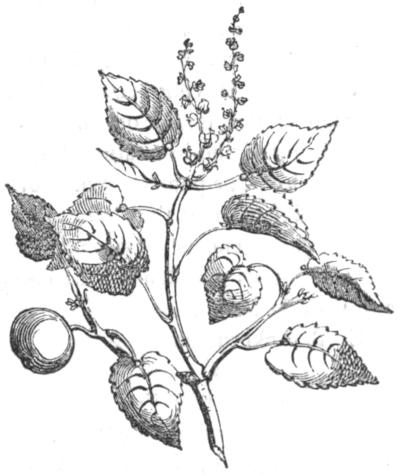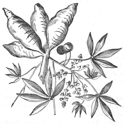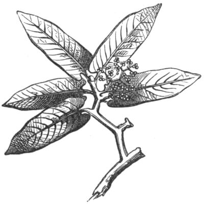This is a tree of some height, the trunk and branches of which are covered with a thick, brownish and reticulate bark.[212] Leaves alternate, oblong, cordate, rather tomentose on their lower surface, and supported by short petioles. Flowers in tufted panicles, ramose, arising from the axil of the leaves or the extremities of the branches; they are dioïchous, with a simple, urceolate perigone having three divisions. Male flowers with six stamens, the filaments of which are attached to each other, and are inserted in a glandular disk. The female flowers are smaller, one unilocular, ovary, style wanting, stygma bilobed. Capsular berry, with two valves, containing an oleaginous seed, surrounded by an aril crenated above. This tree is found in the provinces of Para and Rio-Negro. We use the red juice which is acrid and very poisonous and is obtained by cutting into the bark.