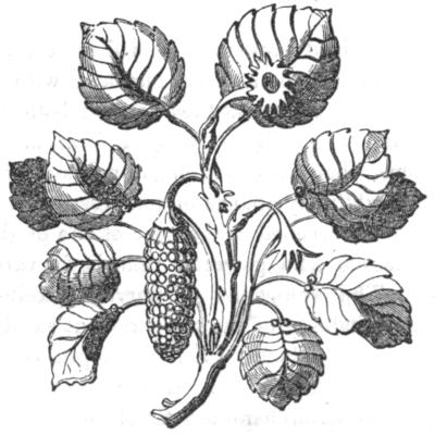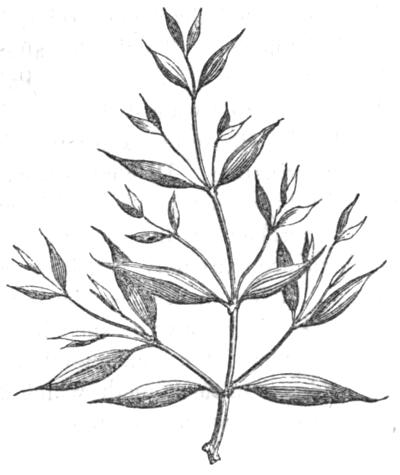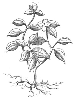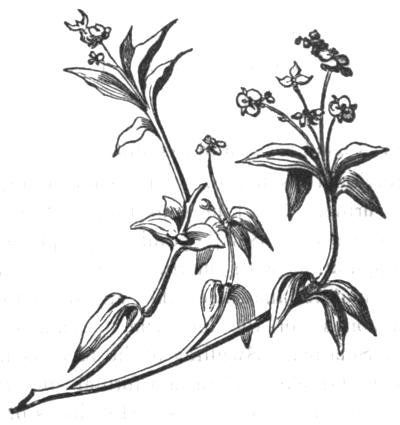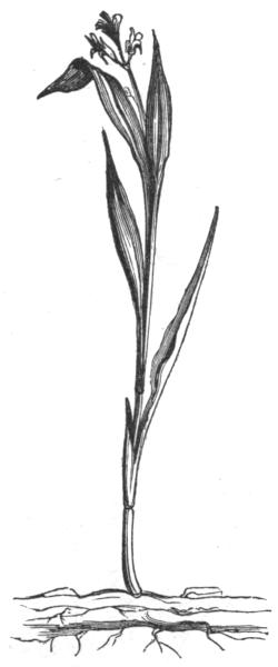 This plant inhabits damp regions, or the borders of brooks. Its stem is erect, cylindrical, growing to a height of about six feet out of a rhizoma sending off numerous rootlets. It is provided with knots, whence arise large alternate clasping leaves, whose lanceolate limbs have strong midribs, sending off fine parallel transverse nerves. At its summit the stem bears the flower-bearing pedicels. Flowers alternate, on short peduncles, and accompanied by bracts. The corol has[210] a double perianth, with three divisions adhering to the triangular, greenish and glandular ovary; the stamens present the changing characters so common in this family. We use the leaves.