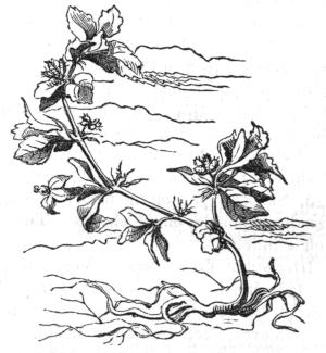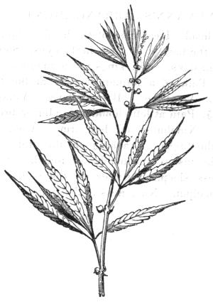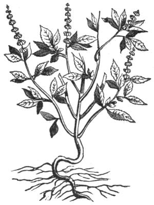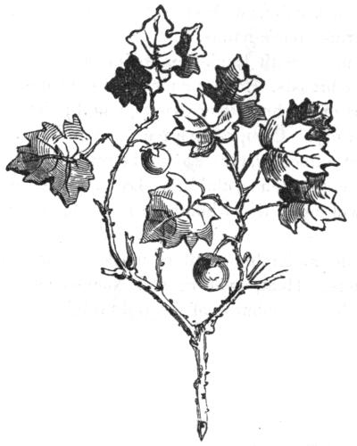This bush grows spontaneously in the provinces of Rio Janeiro, along roads and in cultivated places. It is from 10 to 16 inches high; its branches which bifurcate regularly, are, while young, covered with strong thorns growing from above downwards. Leaves slightly pubescent, cordate, with five obtuse lobes; their nerves are furnished with a few irregularly distributed thorns. The flowers are supported by peduncles arising from the axils of the leaves in groups of two or three. Calix with five parts, very prickly on the outside; corol with five divisions; five stamens; a style. Berry red, fleshy, with two chambers, containing a large number of small seeds. Roots fibrous, arising from a common rhizoma. We use the leaves.