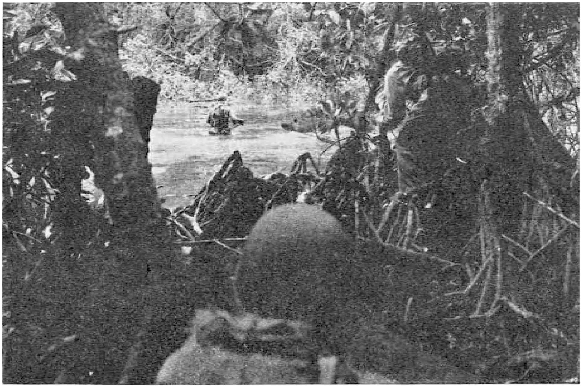 Defensive Action Operation Report, 43d Division, Arundel Island: “Our first contact with the enemy was made by patrols, which encountered small groups of Japs equipped with automatic weapons. Their resistance consisted of a fluid delaying action and, during the early phases, could not be effectively fixed. After a short skirmish the Japs would withdraw several hundred yards and re-establish their temporary defense. The denseness of the jungle made such a defense quite effective in delaying our progress.”