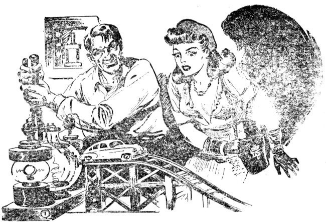 Slim tried the squeezer-upper when he got it finished. He set a couple of old saw-horses inside and, turned on the juice. It was uncanny to see those things shrink. You could even hear the legs scrape on the concrete floor as they pulled together. In just about three seconds the saw-horses were an inch high. Then Slim reversed the current and they expanded to normal size again. All this in about one breath.